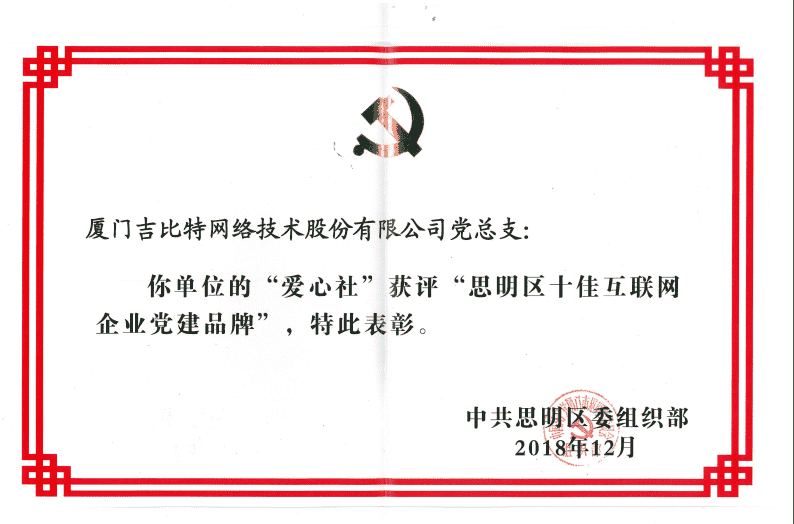 经初审评选、、、网络评选和专家评审等环节,,,,"厦门JIUYOU.COM网络技术股份有限公司党总支-爱心社" 从全区28个参评党建品牌中脱颖而出,,获评"思明区十佳互联网企业党建品牌"。。